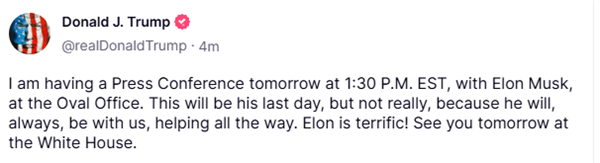 其实不久前马斯克就已公开宣布,随着作为特别政府雇员的任期即将结束,他要感谢特朗普给予减少浪费性开支的机会。