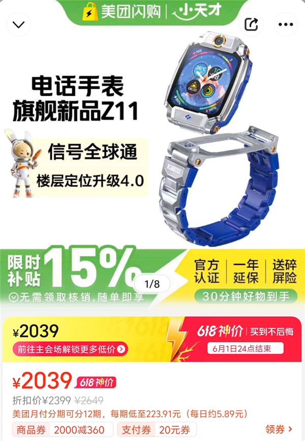 家里孩子又哭又闹,说在学校没牌面,非跟你要小天才最新的旗舰手表 Z11,你一气之下打开美团闪购,发现 618 补贴后来到了 ¥2039。