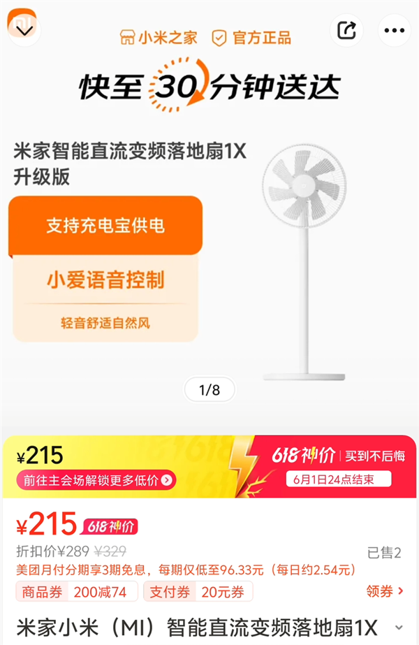 米家变频落地扇 1X 到手 ¥215,昨天杭州升温还在看风扇,今天就跟我说快至 30 分钟送到我家,两局王者荣耀没打完,外卖骑手就能来敲我门。