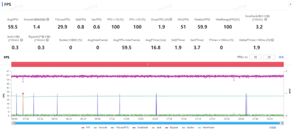 接下来是压力更大的 “ 星铁 ” 星槎海中枢全高画质 30 分钟,平均帧率仍然是 59.5 帧一条直线,表现相当好。