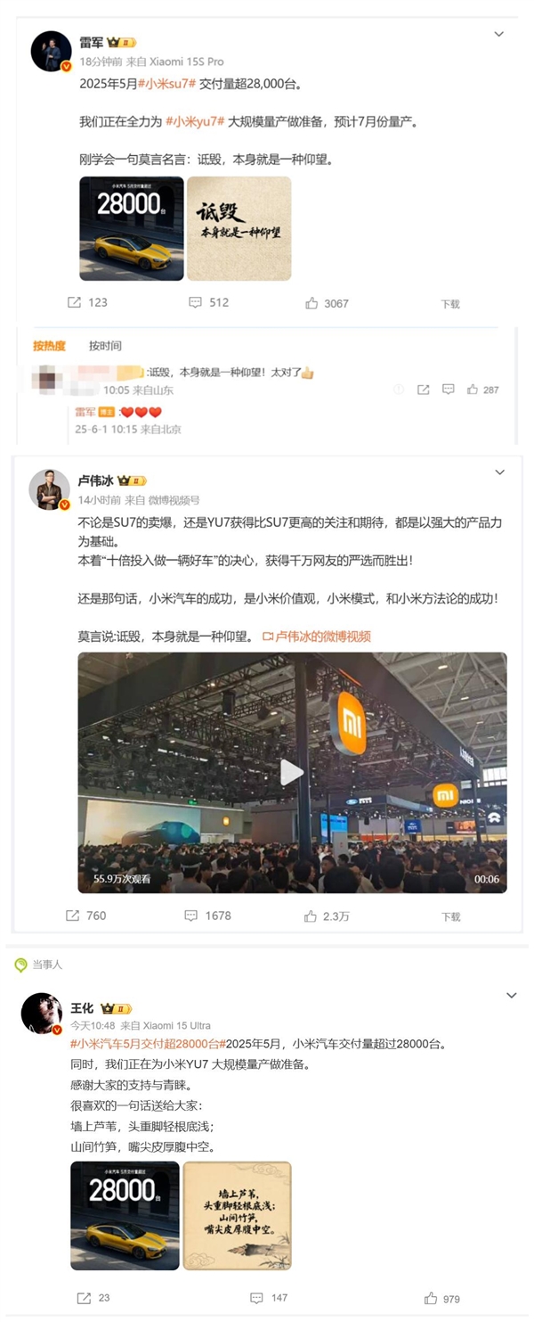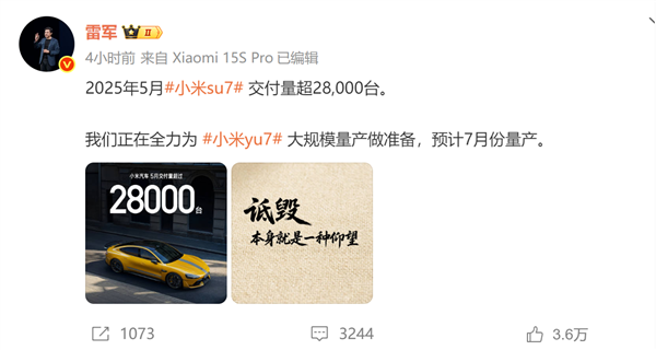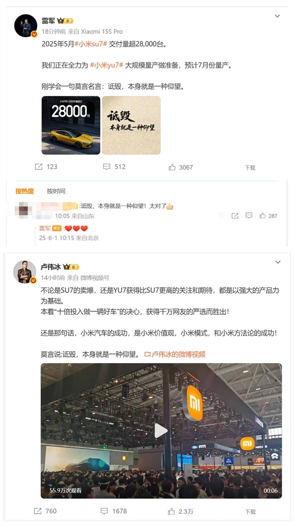 此外,近期小米汽车在市场上的亮眼表现,如5月份交付量突破28000辆大关,以及YU7车型获得的高度关注和期待,都进一步证明了小米产品力的强大和品牌理念的成功。