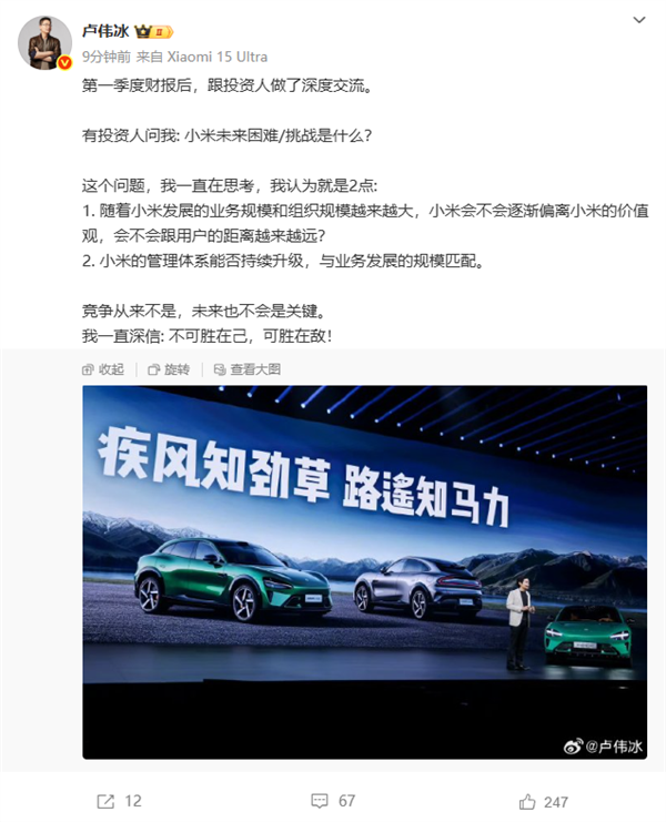 值得注意的是,在回应中,卢伟冰并未将竞争视为未来的关键挑战。他引用古语“不可胜在己,可胜在敌”表达了自己的观点,即小米更应关注自身的修炼和提升,而非过度纠结于外部竞争。