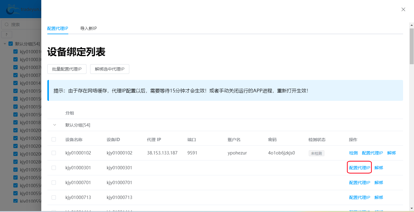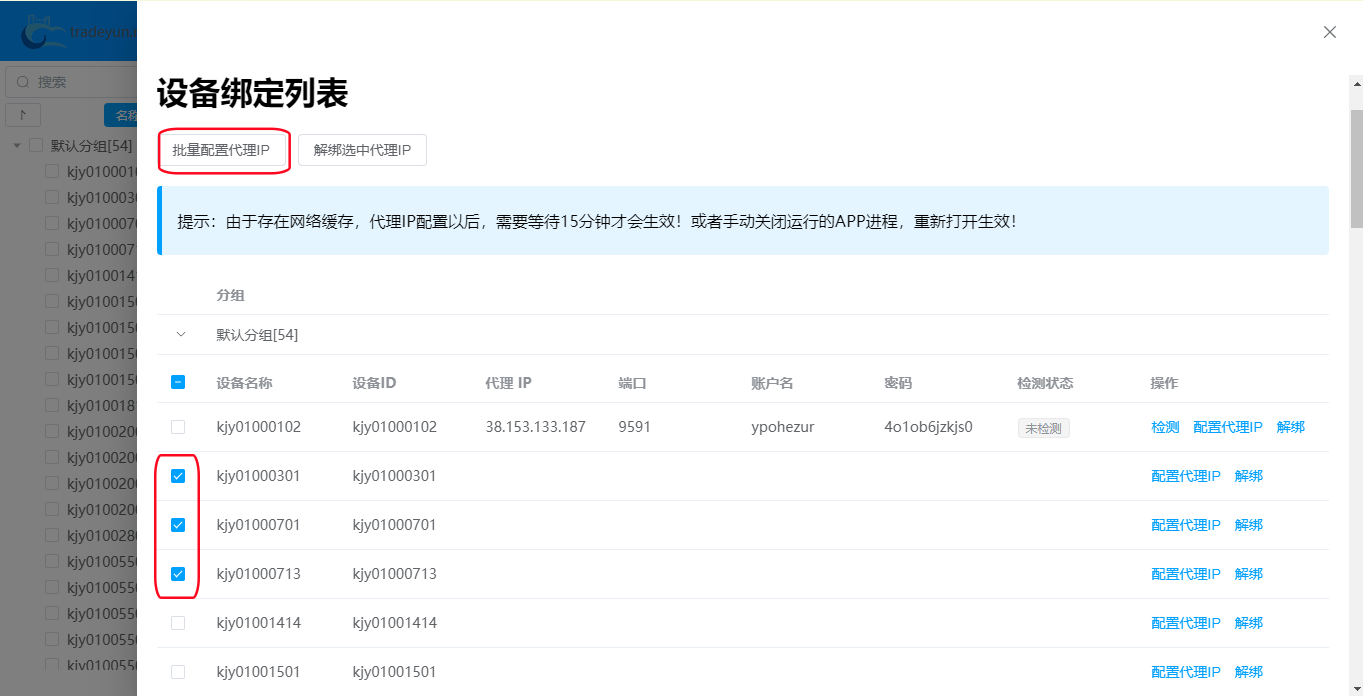 第六步:在列表中勾选多个代理IP,点击右上角的绑定选中的IP, 然后在弹出的确认窗口点击确认,代理IP就成功的配置到对应的设备上去了。