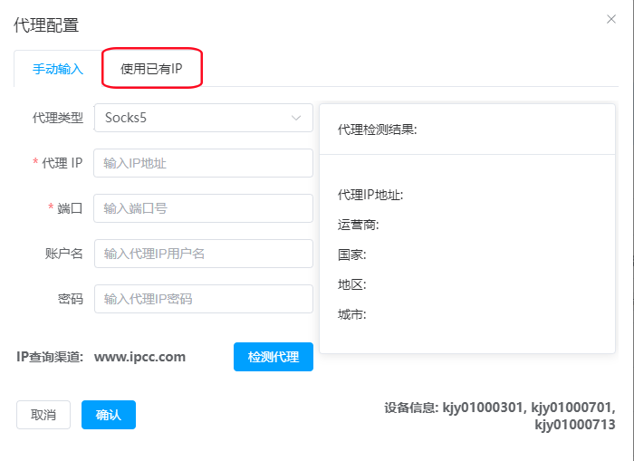 第三步:在详情页填写代理IP的相关参数(包括IP地址+端口号+账户+密码),然后点击确认按钮,代理IP就配置好了。
