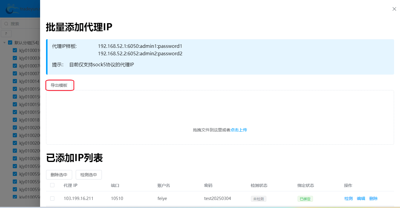 第三步:下载模板,把代理IP批量导入到系统里去。(需要特别注意代理IP的格式为:IP+端口+账户+密码,中间用冒号隔开)