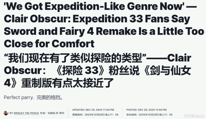 然而,高涨的热情中也夹杂着争议。预告片中展示的战斗系统因与2025年TGA年度游戏《光与影:33号远征队》高度“眼熟”,引发广泛讨论。